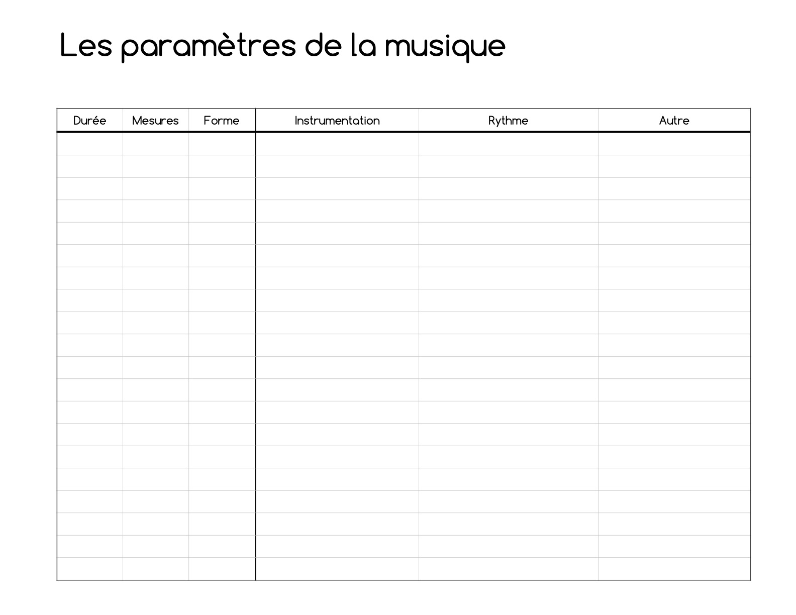2. Copie sur une feuille vierge la grille vierge ci jointe. L’idée est de faire une analyse musicale formelle: Pour ce faire, trouve les phrases (la battue va t’aider), et trouve les thèmes A et B et peut-être C, et leur alternance.